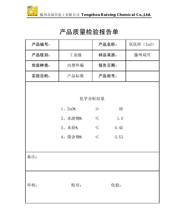 瑞興化工有限公司是生產氧化鋅的重點企業,于2008年通過ISO9001:2008質量管理體系認證。“瑞興”牌氧化鋅在國內擁有較大穩定的市場,并遠銷東南亞、中東、中南美等國家和地區,在國內外享有較高聲譽。